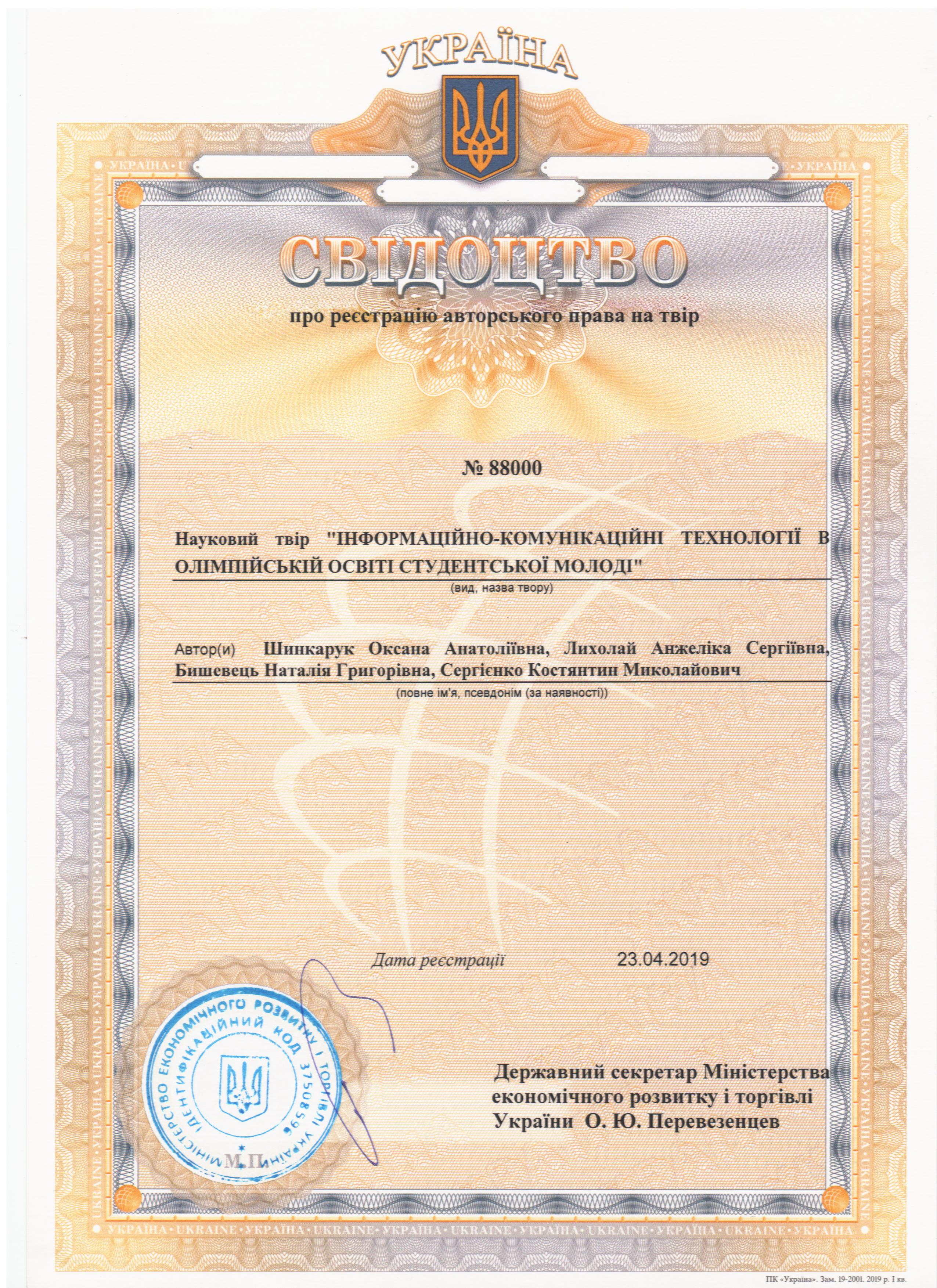 Шинкарук О. А., Лихолай А. С., Бишевець Н. Г., Сергієнко К. М. Свідоцтво про реєстрацію авторського права на науковий твір «Інформаційно-комунікаційні технології в олімпійській освіті студентської молоді ». - № 88000. - 23.04.2019.