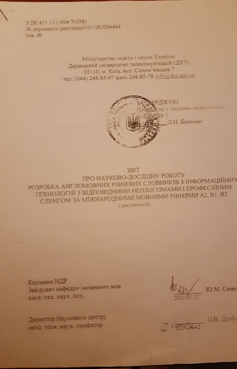 Semenov Y. M., Mycholaychuk A. I., Romaniuk Zh.. G., Zacharzhewska A. A. English – Ukrainian Dictionary : a training manual / Y. M. Semenov, A. I. Mycholaychuk, Zh. G. Romaniuk, A. A. Zacharzhewska A. A. - Kyiv: State University of Telecommunications, 2021. - 103 p.