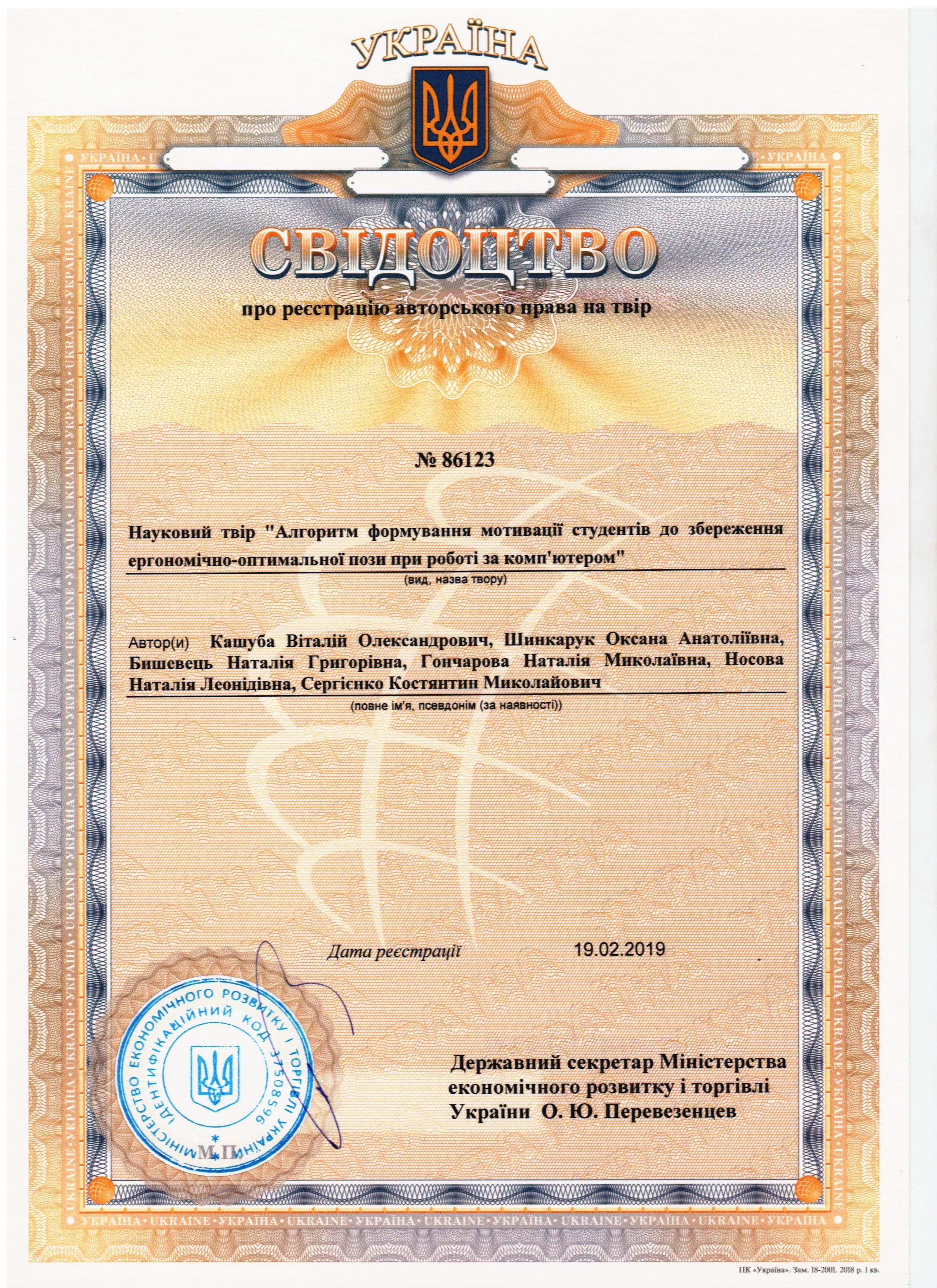 Кашуба В. О., Шинкарук О. А., Бишевець Н. Г., Гончарова Н. М., Носова Н. Л., Сергієнко К. М. Свідоцтво про реєстрацію авторського права на науковий твір «Алгоритм формування мотивації студентів до збереження ергономічно-оптимальної пози при роботі за комп'ютером ». - № 86123. - 19.02.2019.